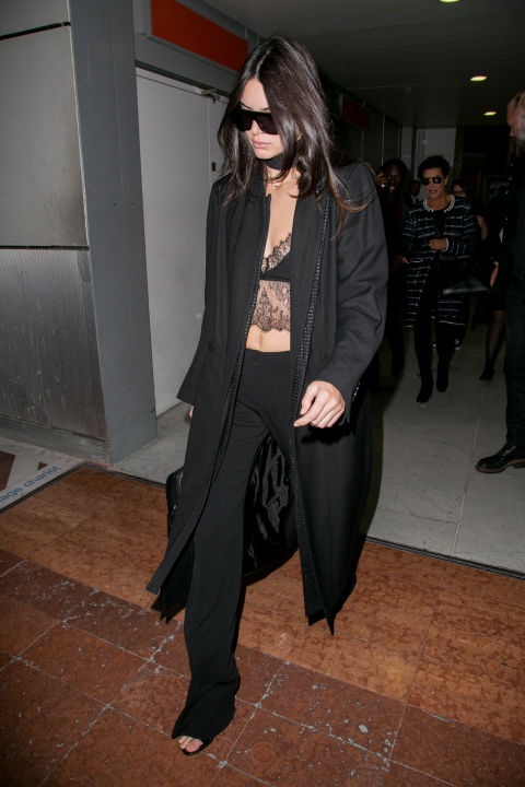 | Kendall Jenner chứng tỏ mình là một trong những ngôi sao luôn đi đầu trào lưu thời trang với chiếc áo dáng nội y chất liệu mỏng tang từ ren. Kendall đã kết hợp khéo léo chiếc áo này trong áo khoác khiến cô không thể duyên dáng và gợi cảm hơn. |