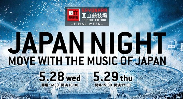 Để nói lời chia tay với sân vận động cũ, sự kiện hòa nhạc Đêm Nhật Bản sẽ được tổ chức vào hai tối ngày 28 và 29/5. Đêm đầu tiên với tên gọi Yell for Japan sẽ có sự góp mặt của FUNKY Kato, YUZU, The Gospellers, Kaori Kishitani, UKASUKA-G, Seiji Kameda… Đêm thứ hai của sự kiện với tên gọi Japan to the World, ban nhạc pop rock nổi tiếng L’Arc~en~Ciel sẽ trình diễn cùng với nhóm nhạc điện tử Perfume, SEKAI NO OWARI và MAN WITH A MISSION. Đêm Nhật Bản cũng đánh dấu lần biểu diễn thứ ba của L’Arc~en~Ciel tại sân vận động này.