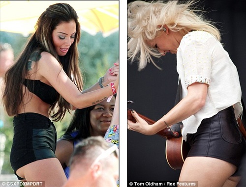 Đôi khi những chiếc quần hot pants ngắn đến mức lộ cả vòng 3. Trong ảnh là nữ ca sĩ Tulisa Contostavlos và Ellie Goulding. |