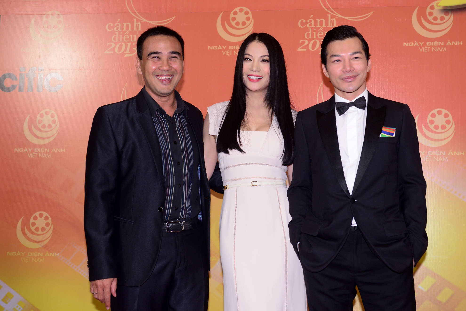 Quyền Linh chụp ảnh kỷ niệm với vợ chồng Trần Bảo Sơn. Tối 15/3, nam diễn viên đã công bố và trao giải thưởng cho Nữ diễn viên chính xuất sắc nhất hạng mục phim truyền hình.