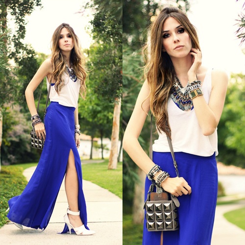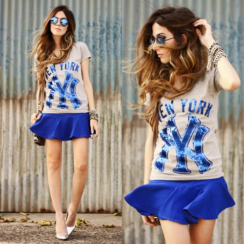Cách mix đẹp mắt với chân váy và áo thun có họa tiết xanh royal.