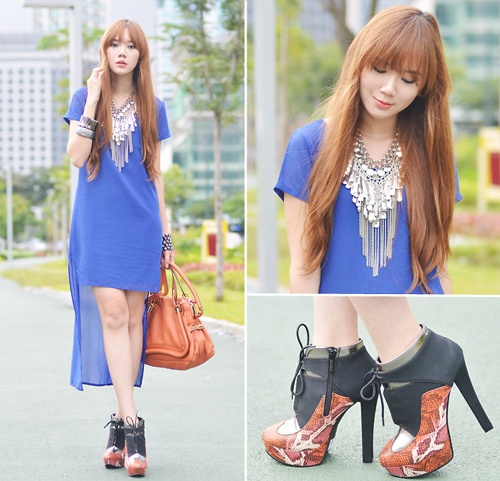 Bạn cũng không thể bỏ qua BST váy xanh royal trong những ngày thu rực rỡ ánh nắng. Váy high low trở nên cá tính khi mix kèm ankle boots.