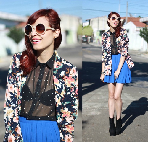 Với sắc màu này, bạn cũng dễ dàng mix với nhiều phong cách khi sử dụng chúng làm chân váy. Váy xòe mix kèm sơ mi và blazer hoa ấn tượng.