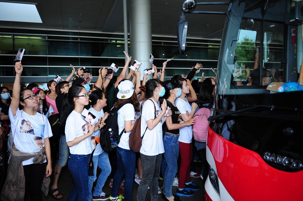 | Các fan nữ mặc đồng phục, tay cầm poster in hình thần tượng ngồi "phục kích" tại sân bay hàng giờ đồng hồ. Họ rất hồ hởi khi được gặp nam diễn viên có gương mặt cá tính xứ Hàn. |