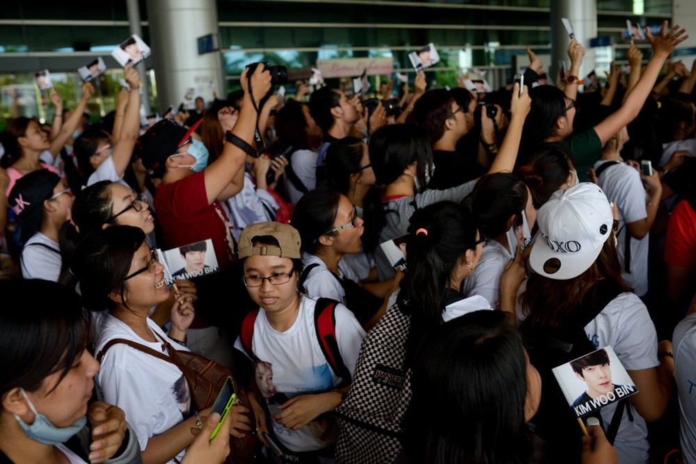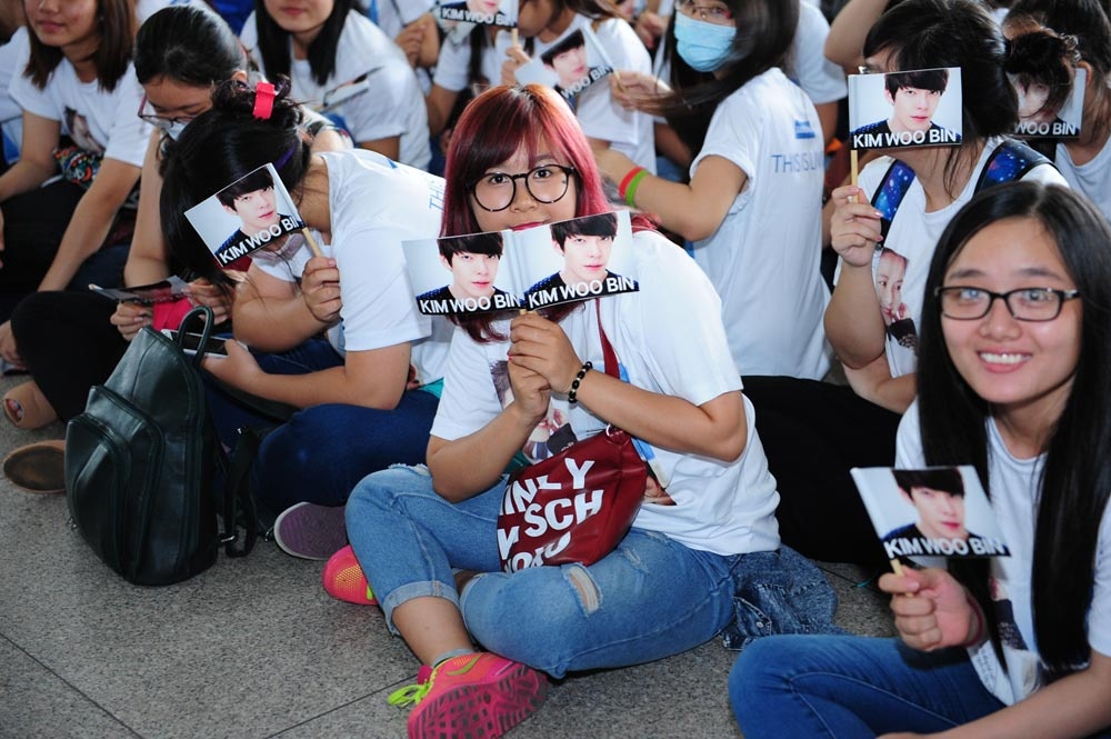 | Khi Kim Woo Bin di chuyển ra xe riêng bằng cửa chính, rất nhiều fan ùa ra để được đứng gần và chụp hình anh. Trước đó, họ đã có mặt tại sân bay quốc tế Tân Sơn Nhất, chờ hàng giờ để đón nam diễn viên. Fan của anh đã xếp hàng dài, giơ cao banner, poster và không ngớt reo hò tên Kim Woo Bin. |