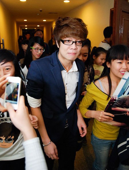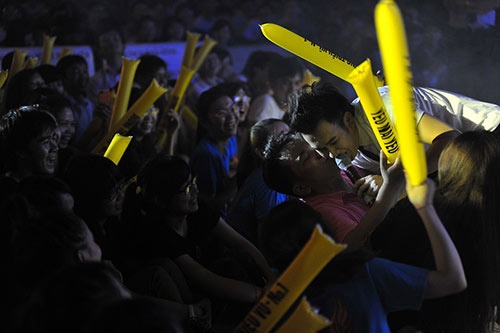 | Trong đêm nhạc Giai nhân vào năm 2011, Mr. Đàm bị một fan nam nhảy lên sân khấu giật micro, ôm chặt và bày tỏ