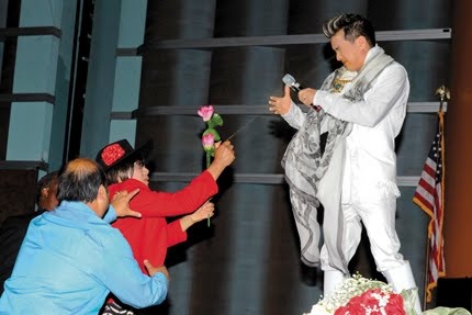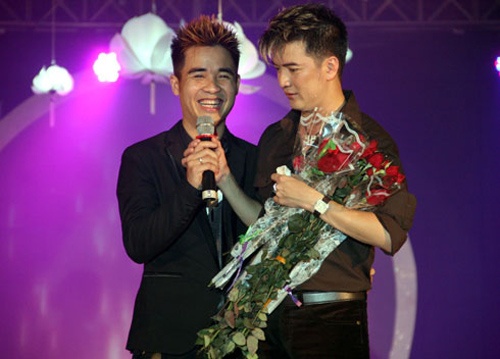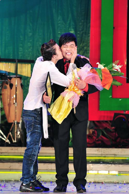 Một khán giả nam ôm hôn Quang Lê thắm thiết trên sân khấu. Vì hai tay đều bận ôm hoa và giải thưởng nên nam ca sĩ hải ngoại chỉ còn biết cười "chịu trận".