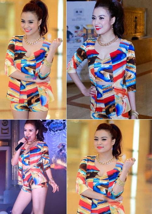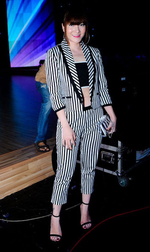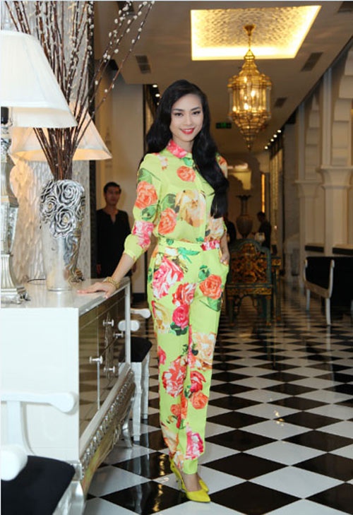 | Cây họa tiết này của Ngô Thanh Vân có phần hơi quá đà về màu sắc. Nhất là khi cô còn diện thêm đôi giày cao gót màu vàng hơi 'lạc điêu' với tông màu chủ đạo của trang phục. |