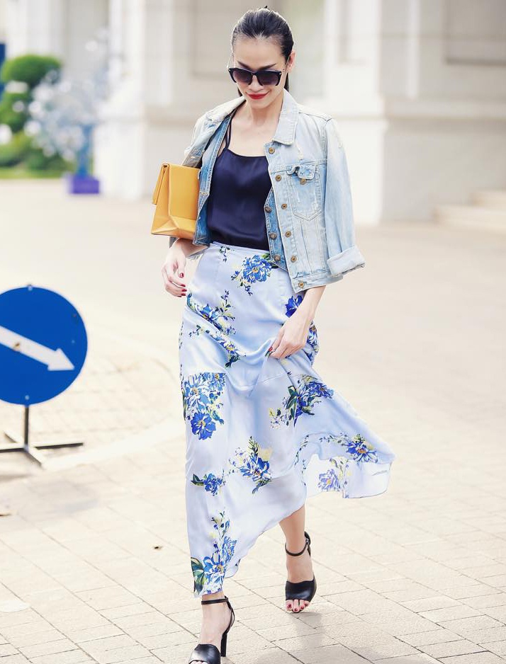 | Một ngày khác, cô ăn vận cá tính hơn với áo jacket denim. Set trang phục bên trong gồm áo hai dây và chân váy dài in họa tiết ăn nhập với hình ảnh hiện đại, phóng khoáng mà không mất đi vẻ duyên dáng. |