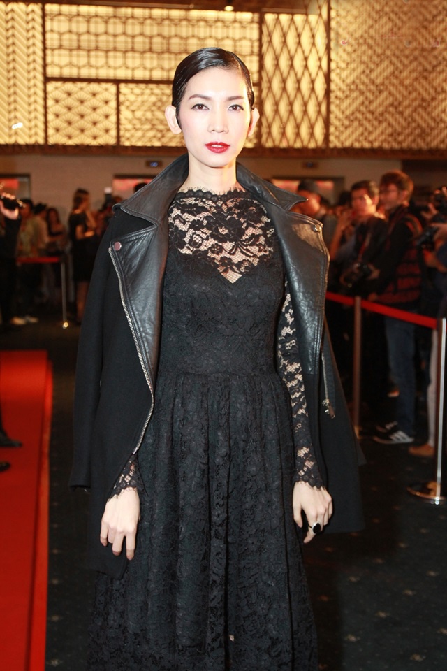 Xuân Lan có cách ứng dụng áo khoác hờ hiệu quả khi kết hợp cùng váy ren tối màu. Áo khoác chất liệu da mạnh mẽ và ren gợi cảm mang đến hình ảnh cá tính cho siêu mẫu.