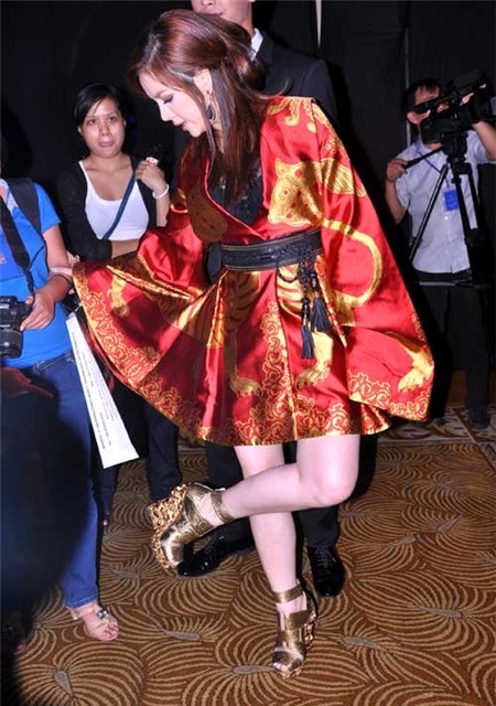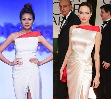 | Chân dài Thanh Hằng dính vào vụ lùm xùm trình diễn một thiết kế "copy" hoàn toàn từ Angelina Jolie. Tuy nhiên, lỗi này hoàn thoàn thuộc về nhà thiết kế trong nước. |