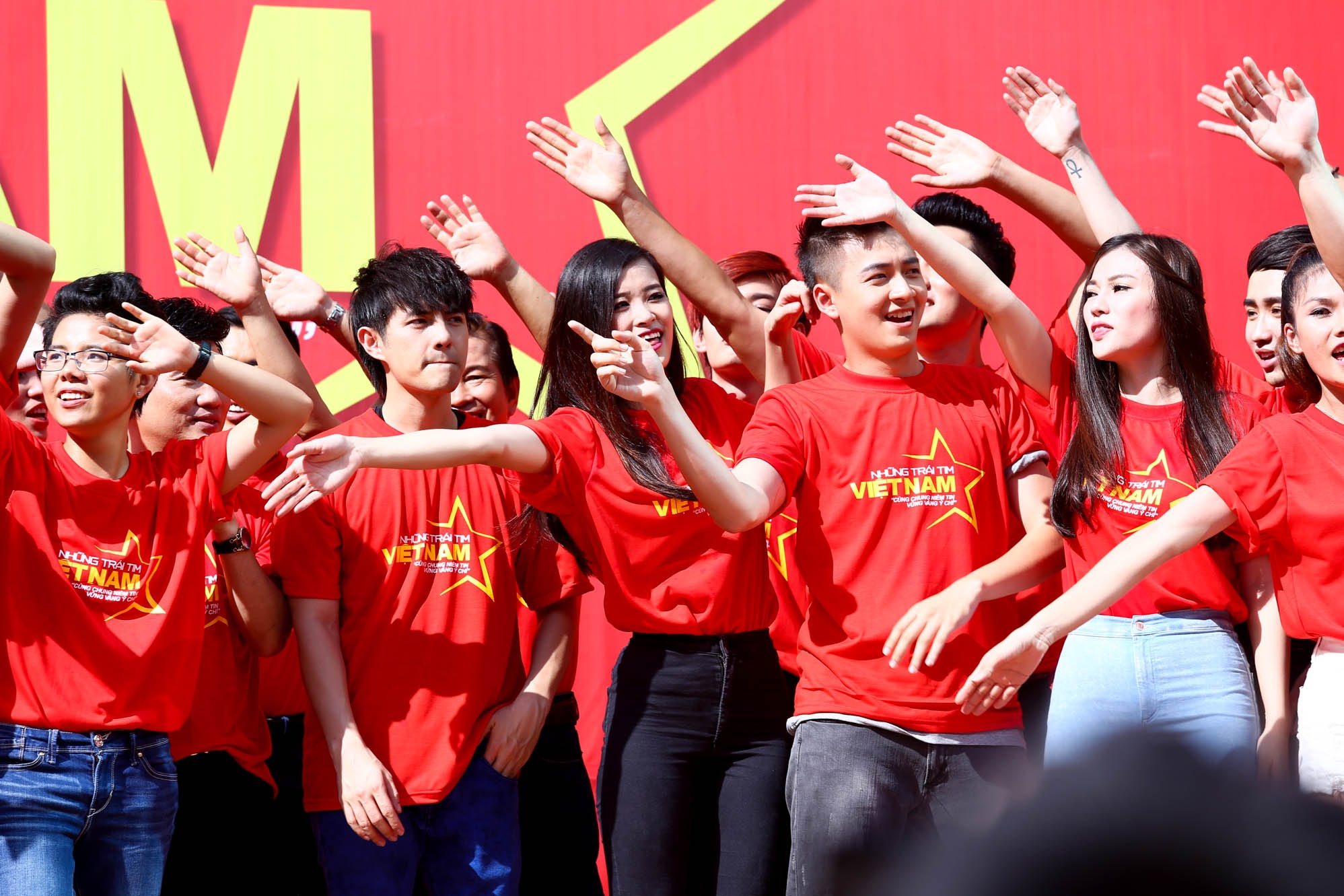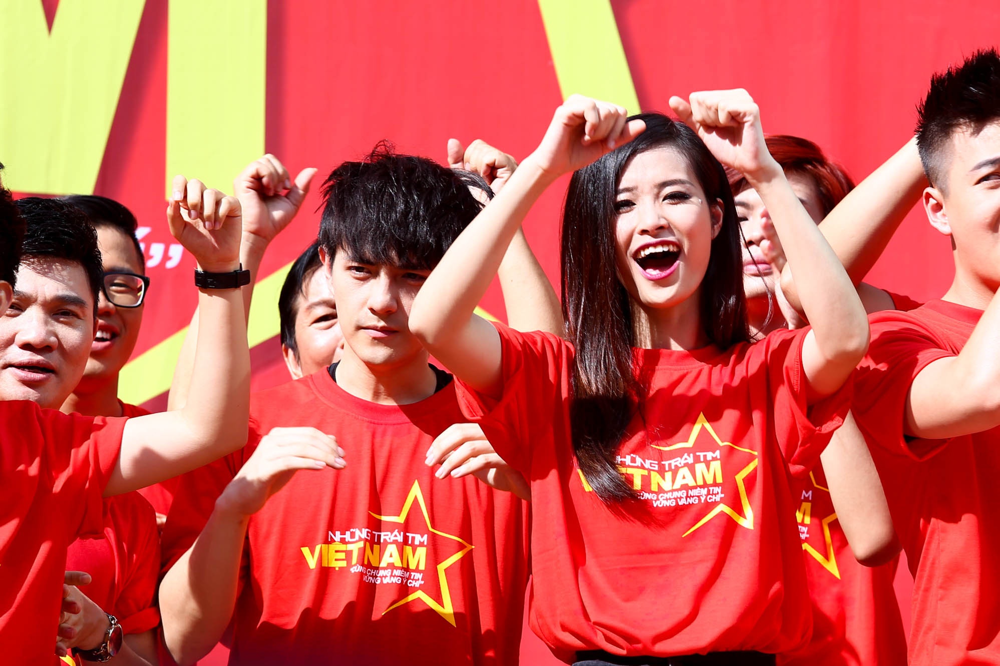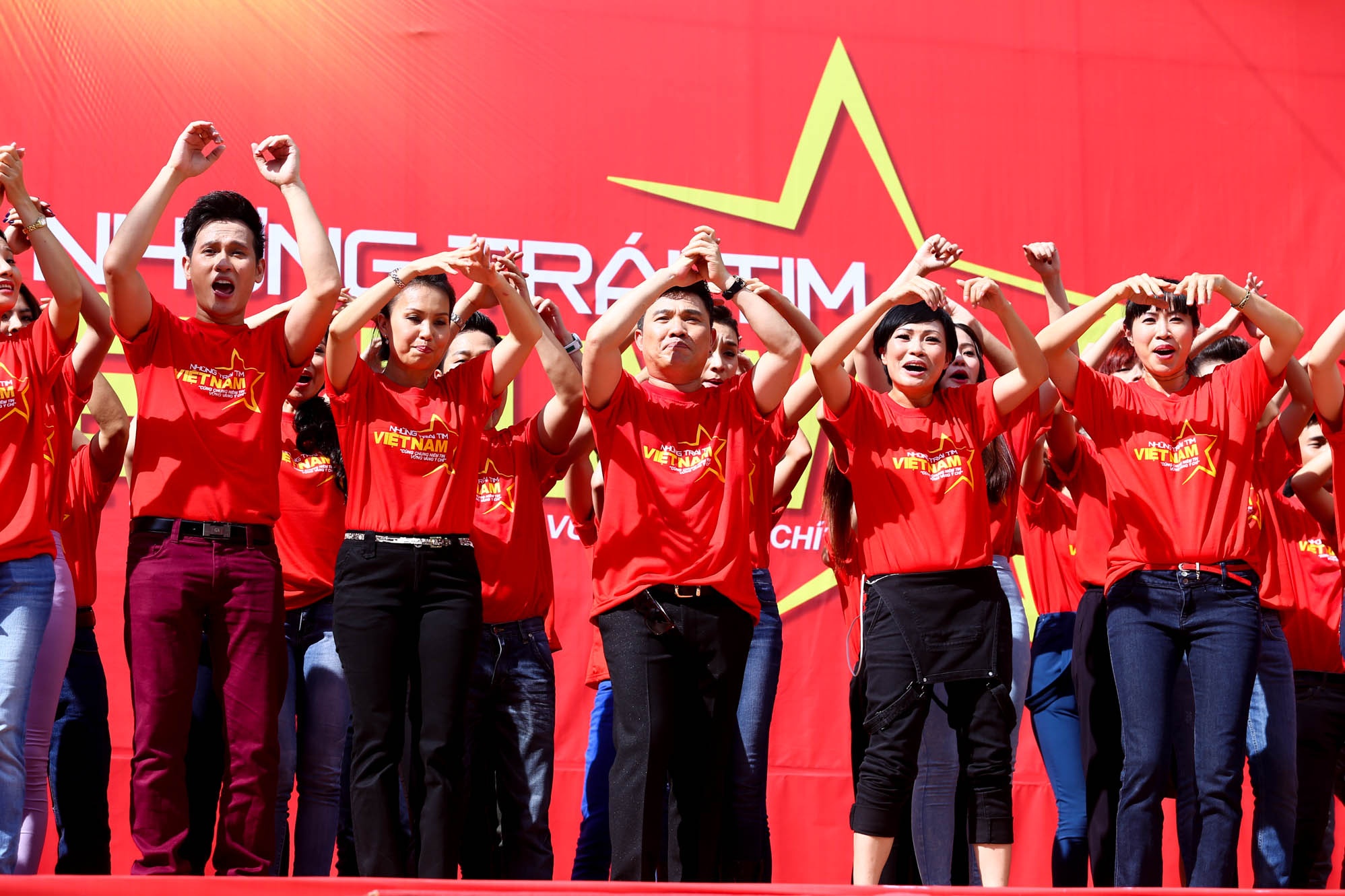 | Ngày 20/5, dưới cái nắng của buổi ban trưa, gần 100 nghệ sĩ Việt và 1000 sinh viên đến từ 5 trường đại học đã cùng nhau tham gia buổi ghi hình cho MV Những trái tim Việt Nam - dự án cộng đồng hướng về Biển Đông do nhạc sĩ Phương Uyên khởi xướng. |