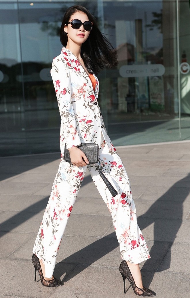 | Trước đó, siêu mẫu từng lăng xê kiểu mốt này khi đảm nhận vai trò giám khảo Vietnam's Next Top Model. Cô khoác lên mình bộ suits đồng màu, điểm nhấn họa tiết hoa cá tính ở cổ áo. Ảnh: FBNV |