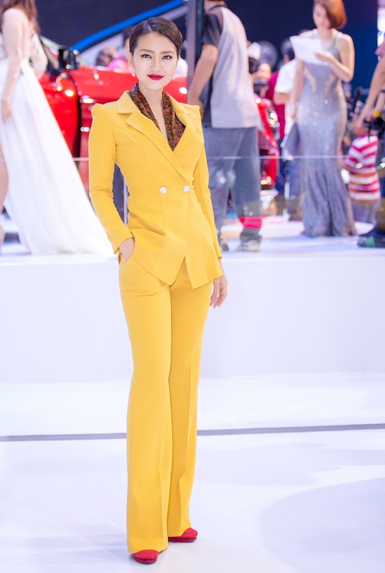 | Cùng diện trang phục của Phạm Đăng Anh Thư, nhưng Ngọc Lan chọn bộ suits vàng bắt mắt. Thiết kế được tạo điểm nhấn với khăn voan ở cổ áo. Quần ống loe đúng chất thập niên trước. Ảnh: Pencil |