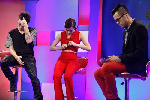 Hoàng Thùy Linh luống cuống chỉnh sửa lại trang phục. Hai MC nam của chương trình cũng không tránh được phút bối rối trước tình huống nhạy cảm của khách mời.