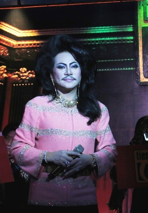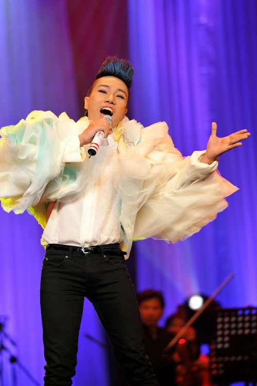 | Ca sĩ hải ngoại Tuấn Anh để lại hình ảnh không mấy đẹp mắt vì gu thời trang lập dị trên sân khấu. Anh thường diện những bộ trang phục được thiết kế độc quyền, đính kết kim sa nữ tính, bắt ánh đèn sân khấu. |
