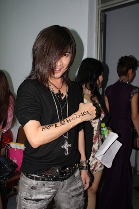 | Đàm Vĩnh Hưng viết tên Lê Hoàng lên tay với hàm ý mỉa mai: "Rất là yêu, yêu lắm đó nha". |