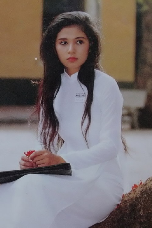 | Hồng Nhung trở lại hồn nhiên với áo dài trắng. |