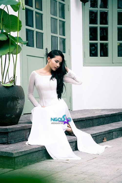 | Hoa hậu Ngọc Hân tươi trẻ trong tà áo dài lụa đơn giản. |