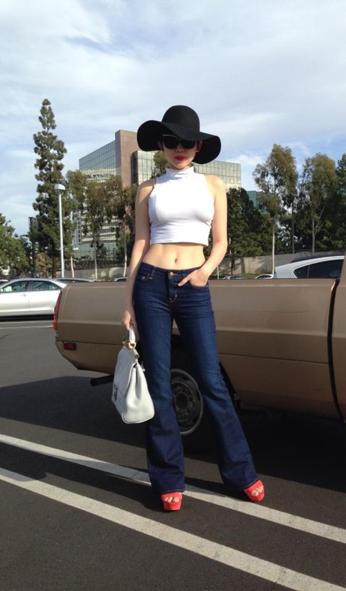 | Ngọc Trinh mang tới hơi hướng công sở với quần jeans ống loe và sơ mi trắng. |