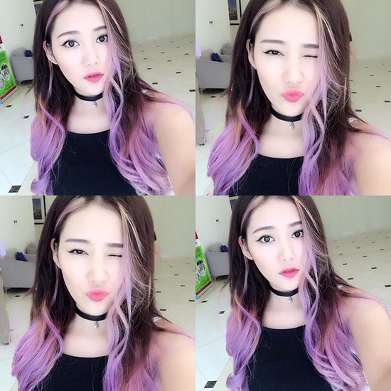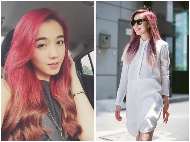 | Cũng yêu thích và sử dụng gam tím, song Hoàng Thùy có cách phối màu cá tính với phần đuôi tóc hồng trẻ trung, ngọt ngào. Kể từ khi nhuộm tóc, quán quân Vietnam's Next Top Model chọn trang phục màu trầm, trung tính tôn mái tóc. |