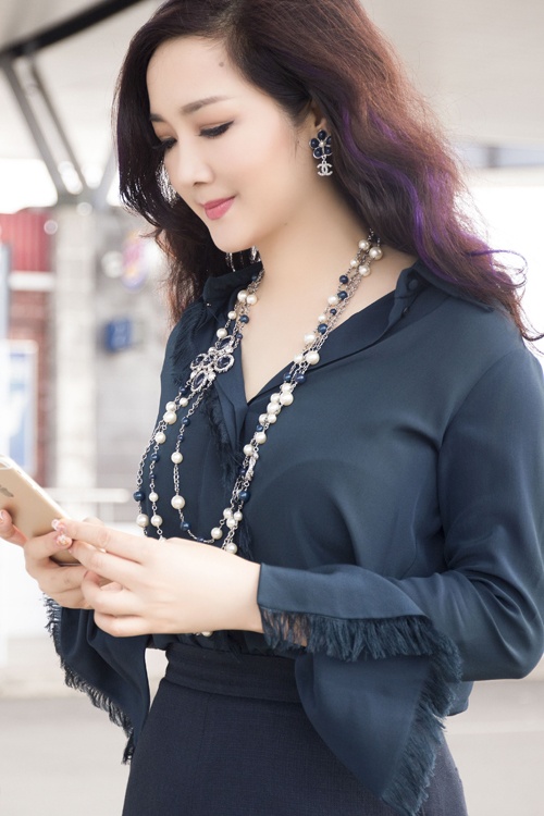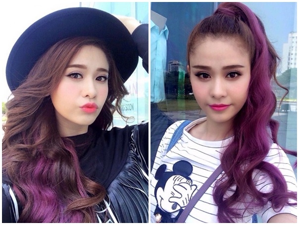 | Khi thực hiện bộ ảnh thời trang mới, Trương Quỳnh Anh đổi style với mốt tóc với màu tím bắt mắt. Mái tóc dài của bà xã Tim được uốn xoăn làm bật lên phần tóc nhuộm trẻ trung. |