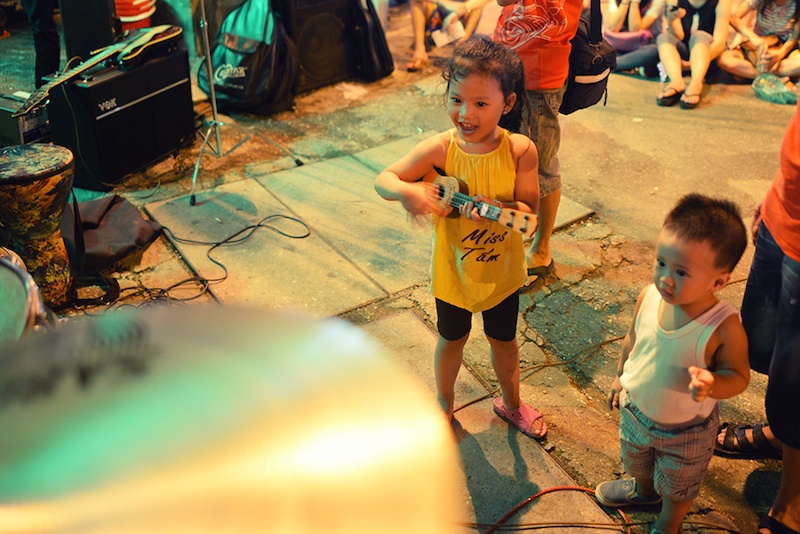 | Các em nhỏ hào hứng khi được xem chương trình âm nhạc diễn ra ngay tại khu vực phố cổ Hà Nội. |