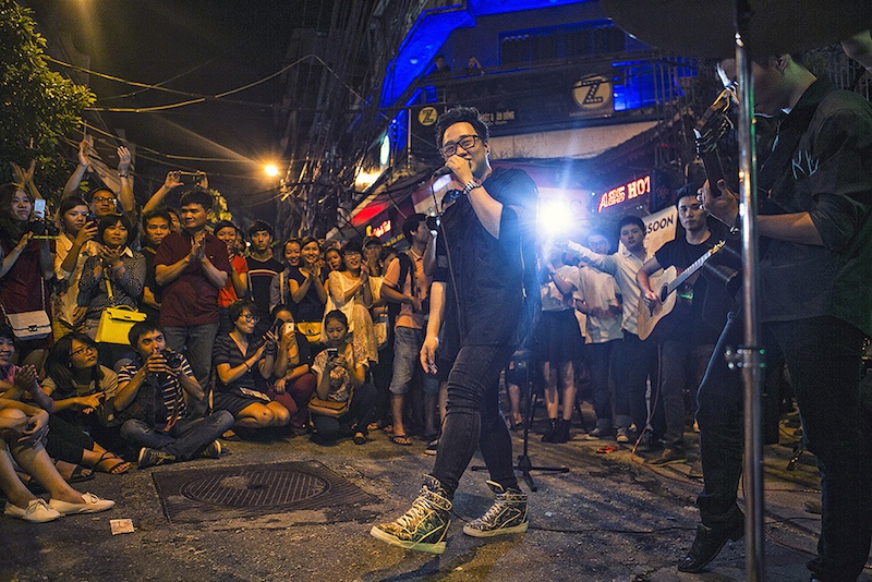 Trung Quân Idol cùng các ca sĩ Sao Mai điểm hẹn 2014 có buổi biểu diễn nghệ thuật tại khu vực phố cổ Hà Nội vào tối 21/9, thu hút sự chú ý của nhiều người đi đường.