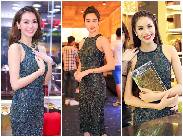 | Thiết kế đính kim sa lấp lánh, ôm vóc dáng của Lê Thanh Hoà được lòng Đặng Thu Thảo, Khánh My và Phạm Hương. Mỗi người đẹp chọn một kiểu tóc riêng biệt để tạo phong cách. Ảnh: Bá Ngọc, HTV, LK |