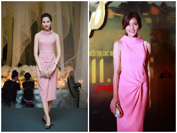 | Đặng Thu Thảo, Triệu Thị Hà cùng chọn trang phục của Lê Thanh Hoà dự sự kiện tháng 12. Thiết kế gam hồng mang đến nét duyên dáng, trang nhã cho hai nhan sắc Việt. Ảnh: NS, An Trần |