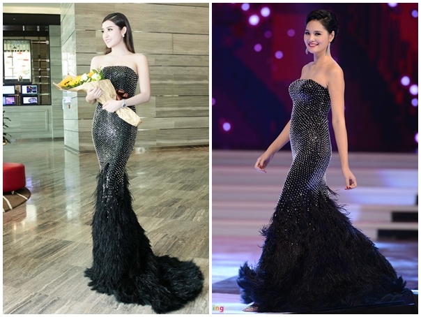 | Huyền My mặc lại đầm đuôi cá đính hạt, kết lông vũ mà Hương Giang từng mặc khi xuất hiện ở vòng bán kết Hoa hậu Hoàn vũ Việt Nam. Ảnh: Tuấn Mark, CL |