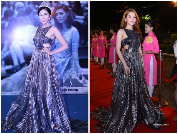| Váy đuôi cá hoạ tiết, phom áo yếm của Chung Thanh Phong tiếp tục được Chi Pu và Trang Pháp ứng dụng. Đụng thiết kế nhưng cả hai đều toát lên vẻ đẹp riêng nhờ tông trang điểm, kiểu tóc khác biệt. Ảnh: Nguyễn Thành |