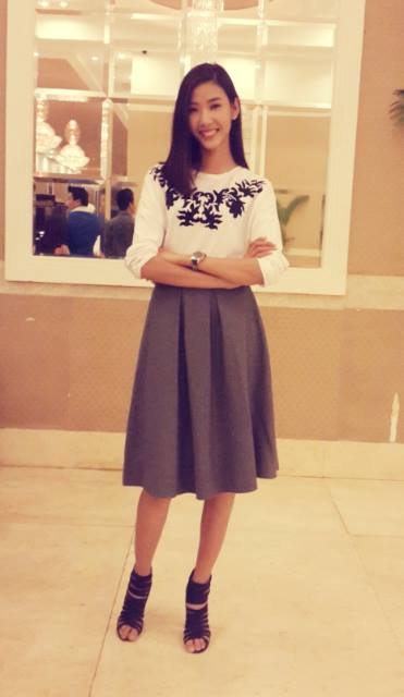 | Hoàng Thùy lại nữ tính với áo sơ mi thêu phối cùng chân váy chữ A xếp ly. Tuy nhiên, đôi sandal ở dưới có vẻ hơi hầm hố với sự nhẹ nhàng, duyên dáng của áo váy bên trên. |