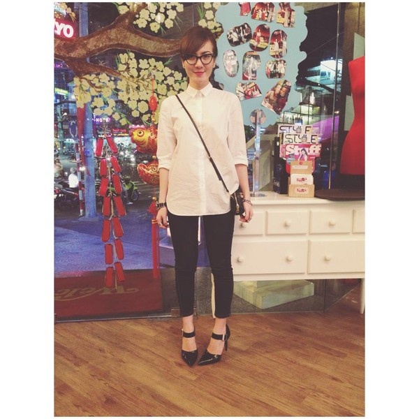 | Yến Nhi đơn giản nhưng cực kỳ sành điệu với sơ mi dáng dài phối cùng skinny jeans và ankle strap mũi nhọn. |