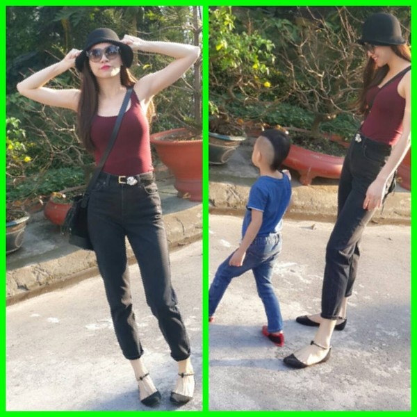 | Hà Hồ vẫn chọn cho mình phong cách khỏe khoắn, gợi cảm như thường lệ khi phối quần baggy cùng áo tank top màu burgundy và giày bệt đen. Để set đồ không bị nhàm chán, cô phối thêm cùng một chiếc mũ rộng vành. |