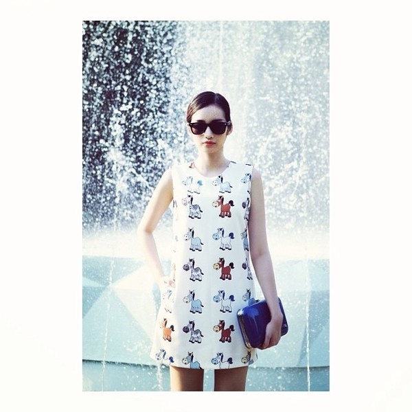 | Trúc Diễm lại chọn cho mình chiếc váy suông in họa tiết ngựa hoạt hình vô cùng dễ thương, phối cùng clutch hộp màu xanh cobalt hài hòa, nổi bật. |