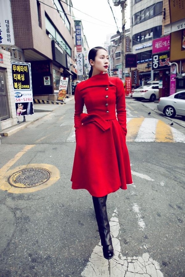 | Thái Hà sang trọng tuyệt đối với áo khoác dáng váy màu đỏ rực, phối cùng boots cao. Đây là một set đồ rất dễ áp dụng nhưng với những quý cô lùn một chút thì hãy chọn cho mình dáng boots ôm sát chân nhé. |