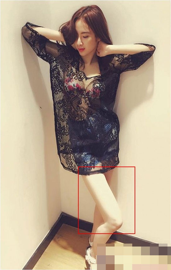Người hâm mộ dễ dàng nhận ra phần đùi của Angela Phương Trinh bất hợp lý vừa teo tóp lại quá dài. Hình ảnh cô đăng tải vào tháng 4/2015 trên trang mạng xã hội cá nhân. |