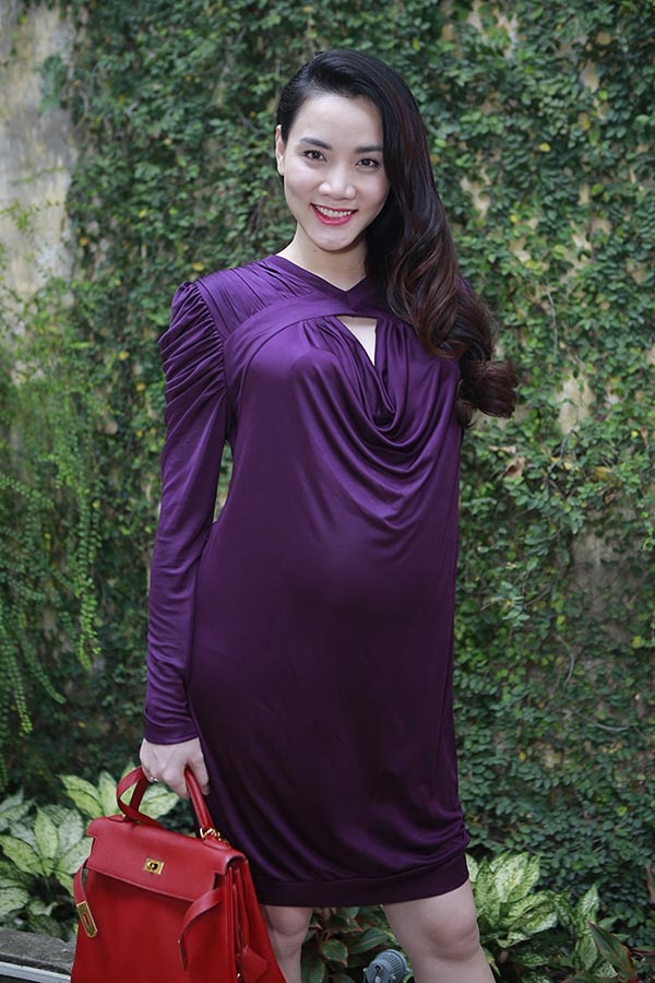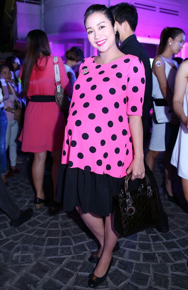 | Khi thai kỳ được 8 tháng tuổi, Ốc Thanh Vân vẫn chạy show, tham dự các chương trình tại TP HCM. Lúc này, cô hạn chế đi giày cao gót nhưng vẫn trang điểm giữ gương mặt tươi tắn. Trang phục tông hồng tiếp tục được bà mẹ ba con chọn lựa. Thiết kế váy suông, diềm xếp nhỏ duyên dáng và nữ tính. |
