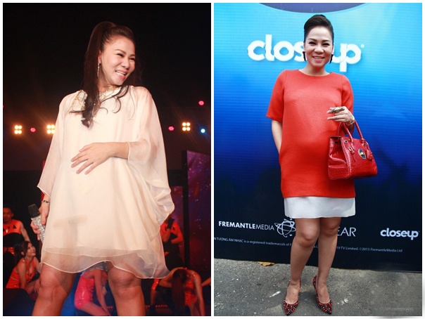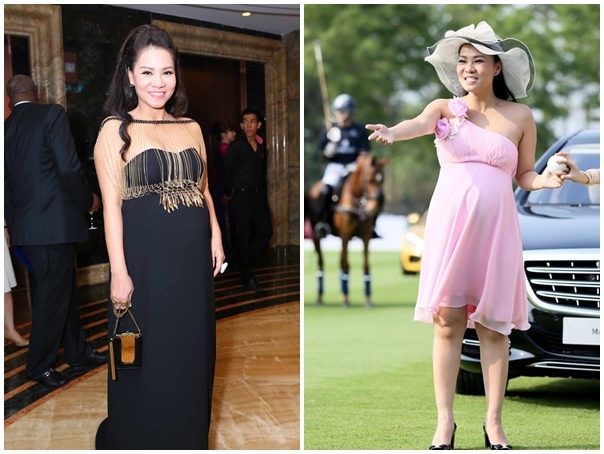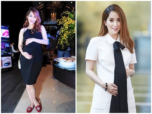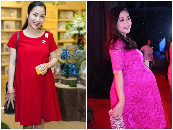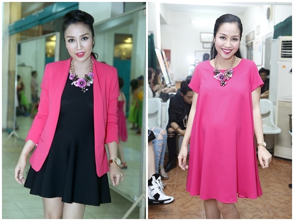 | Ở giai đoạn giữa thai kỳ (ảnh trái), Ốc Thanh Vân chuộng váy suông rộng thoải mái. Song đến những tháng cuối, bà mẹ sinh năm 1984 chọn trang phục sành điệu và diện gam hồng bắt mắt hơn. |