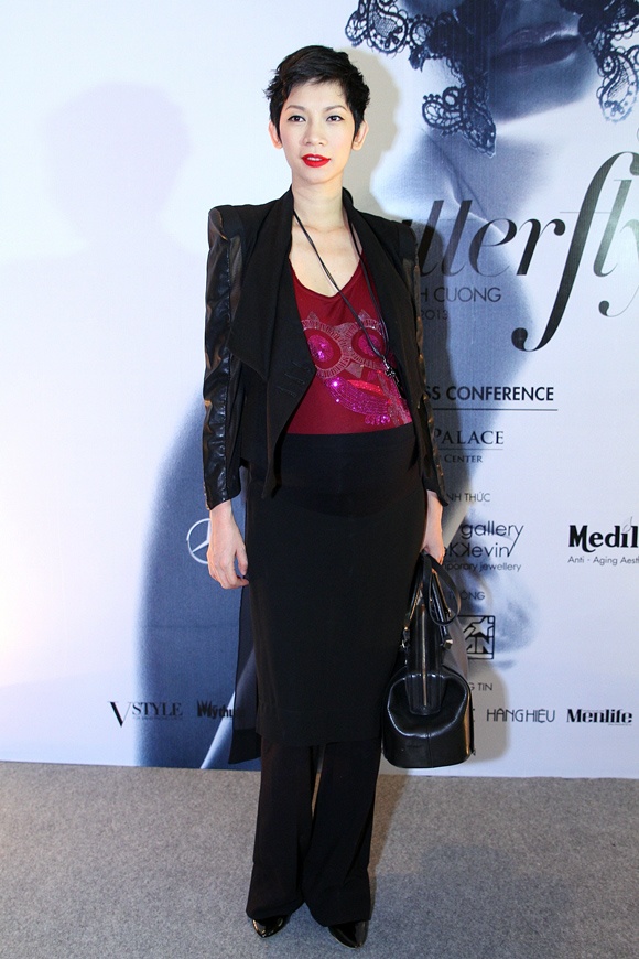 | Cận ngày lâm bồn, Xuân Lan góp mặt tại sự kiện họp báo ra mắt show Những cánh bướm cuối thu của nhà thiết kế thân thiết Đỗ Mạnh Cường. Thời trang bầu giai đoạn cuối của Xuân Lan vẫn là trang phục năng động, hiện đại. |