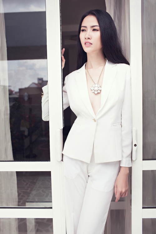 | Phan Thị Mơ bỏ quên nội y với kiểu vest hết sức thanh lịch và gợi cảm. |