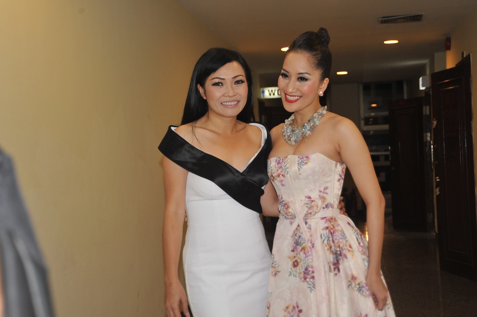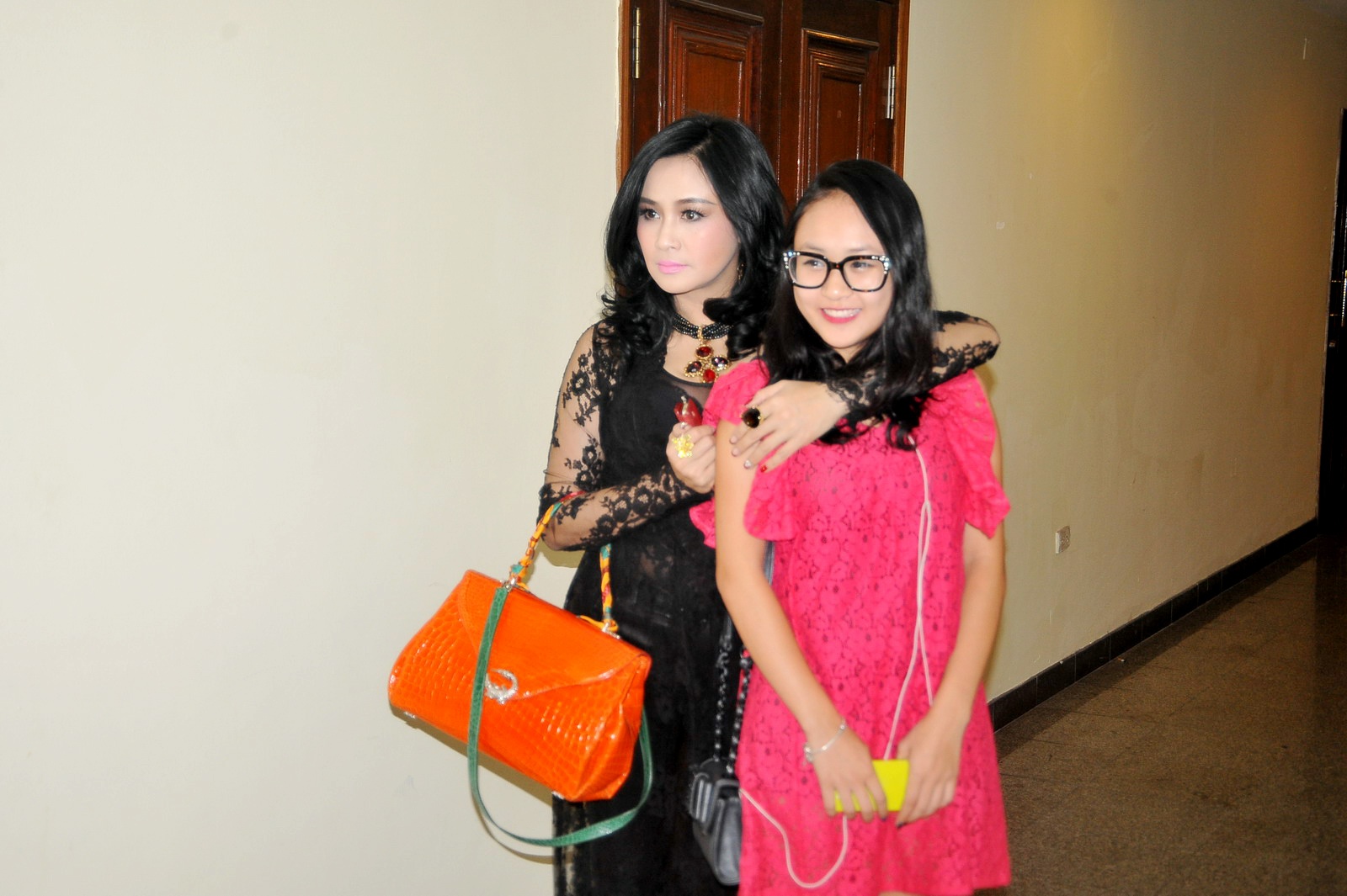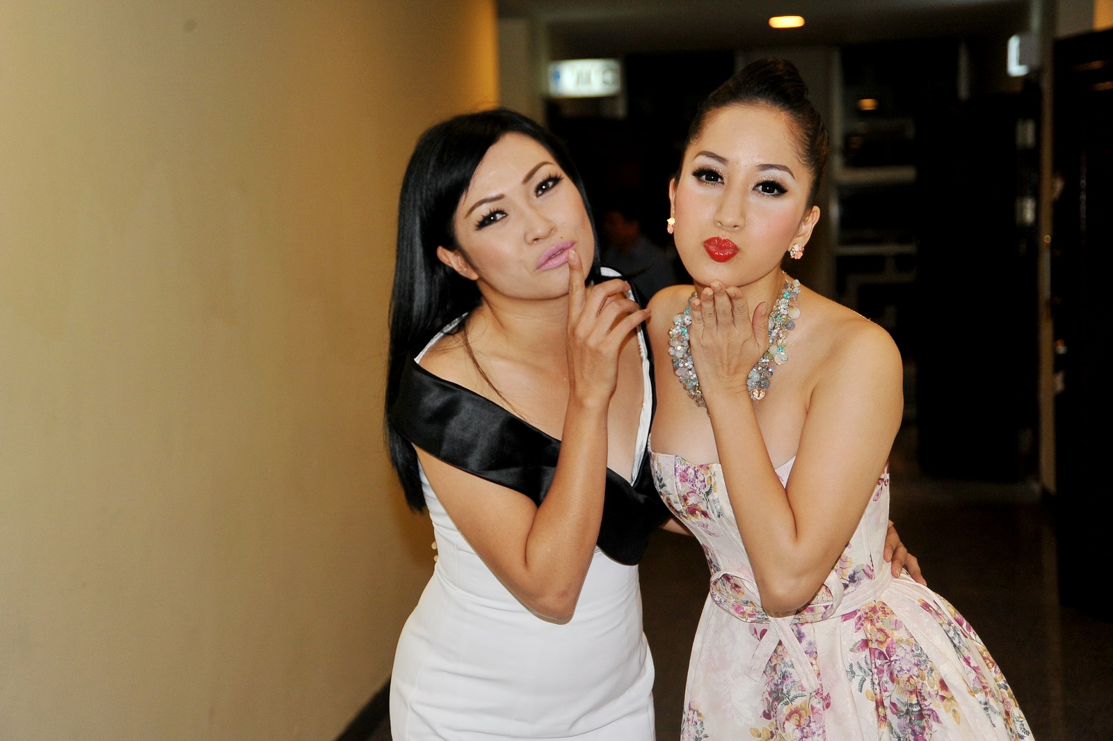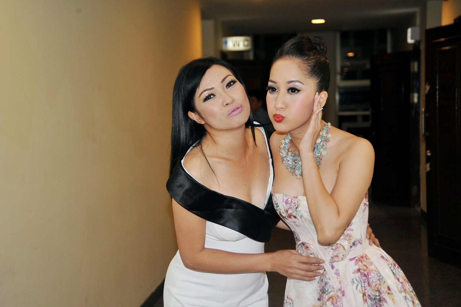 | Phương Thanh và Khánh Thi tạo dáng nhí nhảnh trước khi ra diễn. |