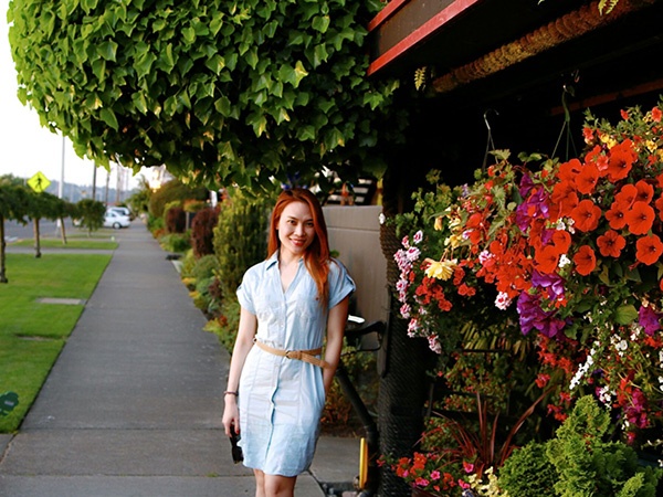 | Hình ảnh bà mẹ một con trẻ trung trong mẫu váy sơ mi đậm chất cổ điển. |