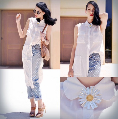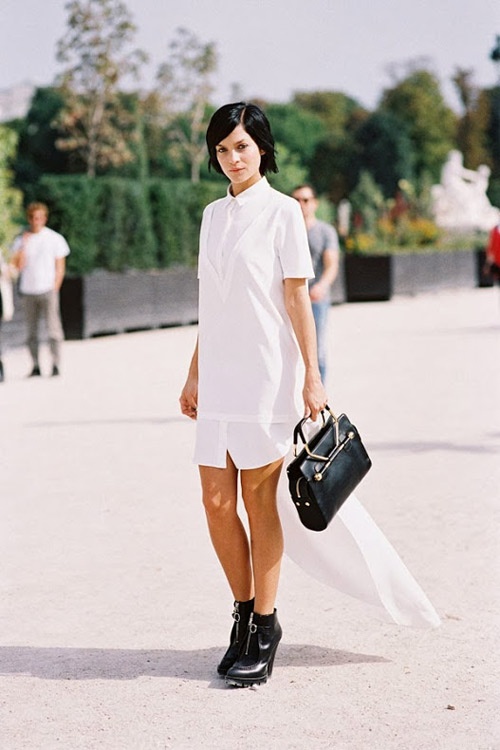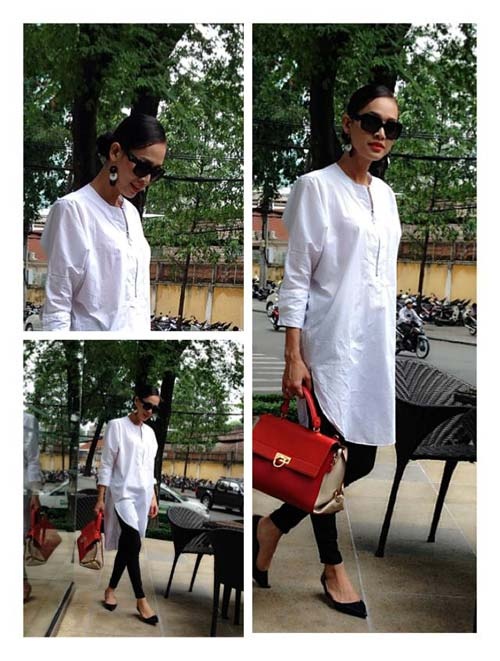 | Chiếc sơ mi trắng dáng dài chấm gối được Chipu phối rất sành điệu với các món phụ kiện màu đen. |
