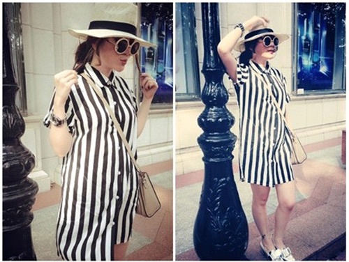 | Chiếc sơ mi kẻ sọc dáng dài được Yến Nhi mặc thành váy và tạo vóc dáng cao ráo cho cô. |