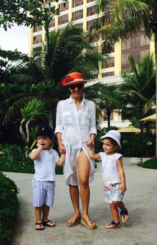 | Hồng Nhung diện sơ mi trắng dài chấm gối dạo phố cùng 2 bé sinh đôi. |