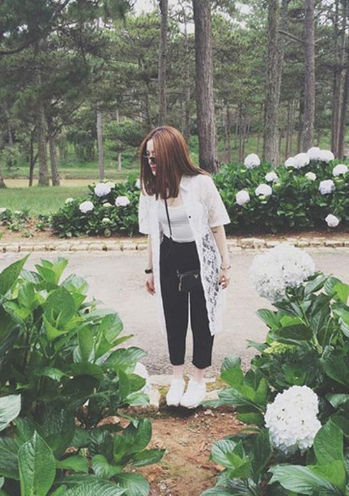 | Kiểu sơ mi ren cách điệu được Yến Nhi mặc thành chiếc áo khoác mỏng trong ngày se lạnh. |