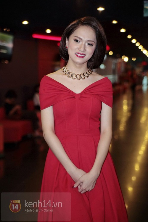 | Với chiếc đầm đỏ trơn, Hương Giang khéo léo mix cùng vòng cổ màu ánh kim để tạo điểm nhấn. |