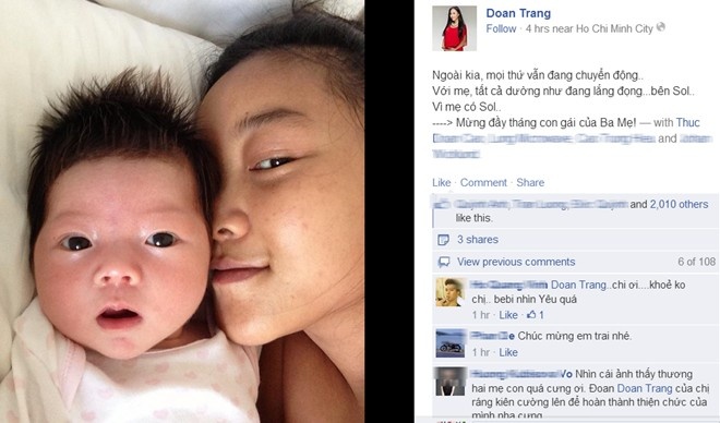| Nữ ca sĩ đã lần đầu khoe ảnh con gái đáng yêu trên trang cá nhân nhân dịp bé đầy tháng. Cô viết: "Ngoài kia, mọi thứ vẫn đang chuyển động. Với mẹ, tất cả dường như đang lắng đọng... bên Sol. Vì mẹ có Sol. Mừng đầy tháng con gái của ba mẹ!". Ảnh: Facebook nhân vật. |